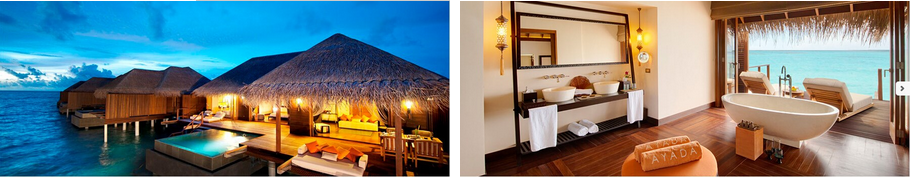 阿雅达岛海洋别墅位于海上,窗外便是印度洋的美景。别墅设有36平方米的卧室,22平方米的浴室,50平方米的阳台,15平方米的私人游泳池和一张观海吊床。让宾客可在宁谧的海上休息并享受日光浴,悠然自得。