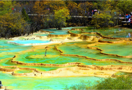 约12:30:出发前往游览国家 5A 级景区【黄龙名胜风景区】(游览时间约 180 分钟);黄龙以它“奇、绝、秀、幽”的自然景观而蜚声中外,景区内数千个钙化彩池形态各异,流光泛彩,长达 2500 米的钙化硫是世界之最,沿途主要景点有洗身洞、金沙铺地、盆景池、黄龙洞、黄龙寺、石塔镇海、五彩池、转花玉池等,游览时请量力而行(可自费乘索道上行 80/人,下行 40/人),欣赏露天岩溶地貌,尽享人间瑶池。